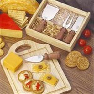 - Four serving tools with stainless steel blades and hardwood handles- Hardwood cutting board with cutout handle